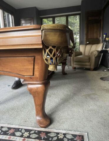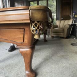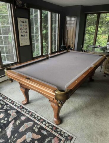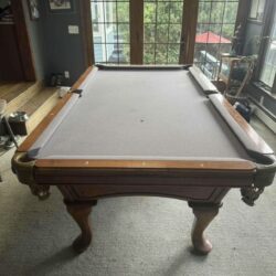 Quality AMF pool table with a 3-piece slate top. Strong hardwood construction, smooth playability, and a beautiful deep honey finish with detailed framing. The table is in great shape and ready for delivery.