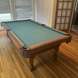Beautiful 8ft Olhausen pool table featuring a stunning deep oak finish, elegant ram head legs, and a richly detailed frame that gives it a classic furniture-style look. Save big compared to buying new without compromising on quality!