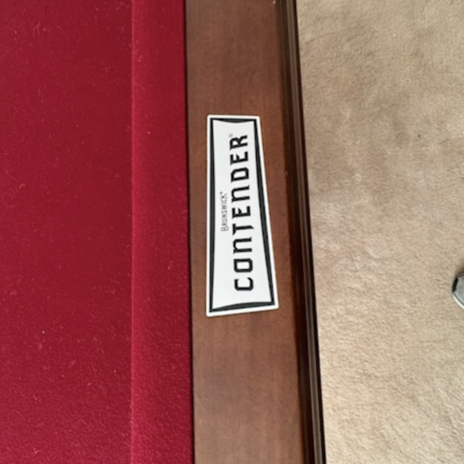 A beautiful, furniture-grade Brunswick Contender pool table in excellent condition, finished in a rich brown tone that highlights its elegant lines and classic craftsmanship. The traditional Ball & Claw legs add a timeless, upscale presence, making this table a standout addition to any home or entertainment space.